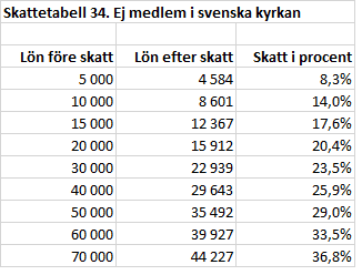 Jag har både varit medelinkomsttagare under mina första år i arbetslivet, legat strax över brytpunkten för statlig skatt på slutet av mitt arbetsliv och de senaste åren varit lågavlönad på nivån deltidsarbetare med minimilön. Jag har också haft ett litet kapital och ett lite större kapital. Så jag tycker jag testat det mesta när det kommer till att betala skatt på olika sätt. Och jag har ingen stark åsikt om exakt vad som vore en rimlig eller rättvis skatt på det ena eller andra. Utan min åsikt att det är oväntat låga skatter på låga löner baserat egentligen på min bild som jag hade för några år sedan att man inte betalade någon skatt alls på de första 20 000 kr per år man tjänar, sen att man betalar runt 30% skatt upp till gränsen för statlig skatt och därefter runt 50% skatt på inkomster över den gränsen. När jag började kolla upp detta lite visade sig det inte alls vara fallet.