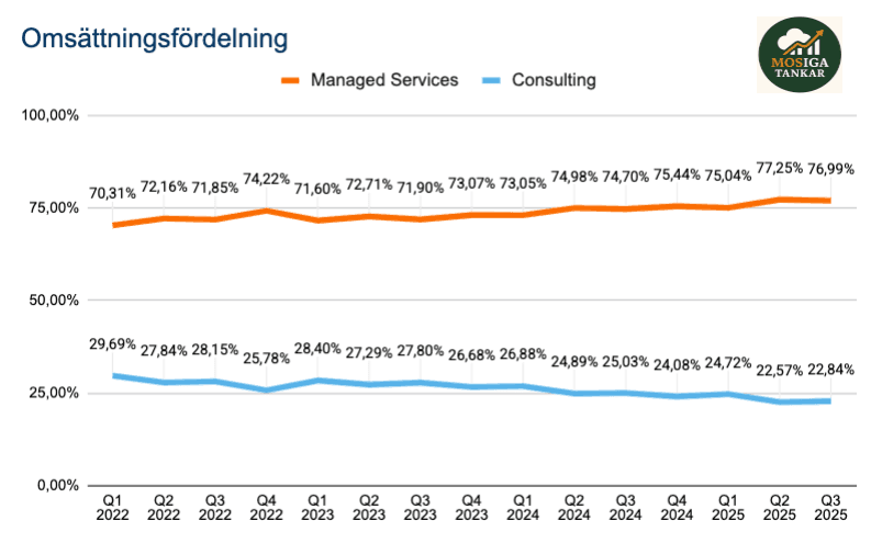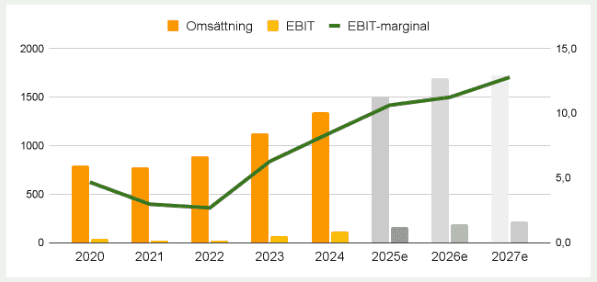 Med en intäktsmix som domineras av återkommande serviceavtal (kring tre fjärdedelar av intäkterna) och en växande kontrakterad bas som successivt går live, finns förutsättningar för vinsttillväxt som kan bli högre än omsättningstillväxten genom skaleffekter, standardisering och bättre beläggning i leveransen.