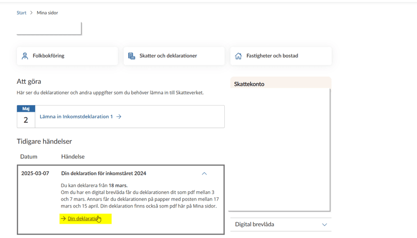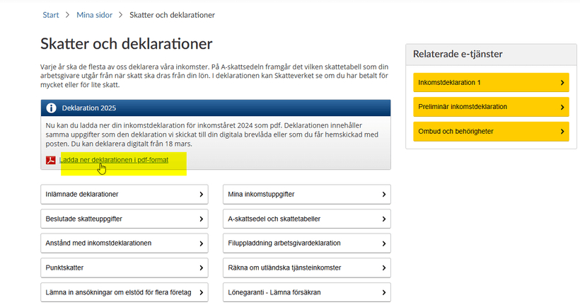 Om det är så att du vill titta på din deklaration i den “gula formatet”, så kan du ladda ner det som pdf enligt nedan bilder.