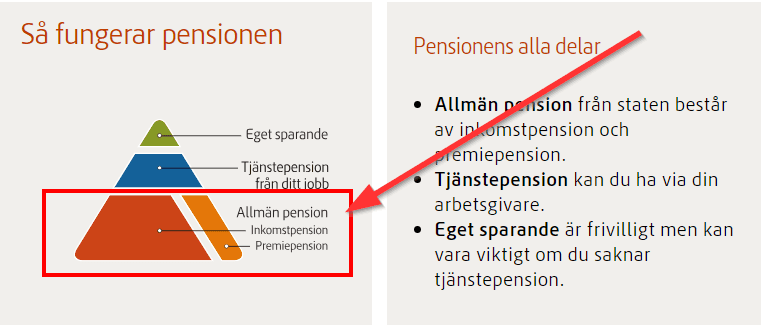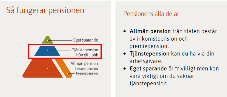 Sedan finns även eget sparande och tjänstepension eller avtalspension som det även kallas för i pensions triangeln ovan. Via Min Pension kan du enkelt se hur du ligger till med din egna pension.