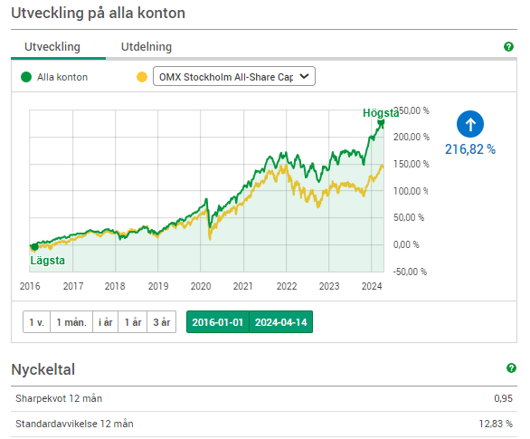 Det har inte hänt som mycket förändringar sedan förra presententationen som gjordes i början av året för ett kvartal sedan. Novo Nordisk och Bravida är de aktier som fått lite mer andel av portföljen. Planen framöver är att göra mindre månatliga insättningar och dessa räknar jag med att vara väldigt små. Portföljen är en väldigt passiv och kostnadsmedveten portfölj, som går på automaitk och ger en hyfsad bra riskjusterad avkastning. Är nöjd med det och håller mig till strategin.