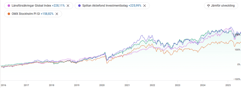 Ovan en graf på hur portföljen utvecklats sedan 2016. Jämförelsen är med Länsförsäkringar Global Index och Spiltan Aktiefond Investmentbolag, som jag skulle kunna tänka mig byta större del av portföljen till.