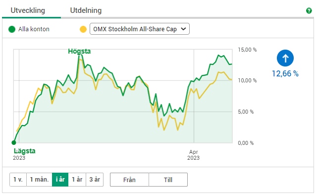 Portföljen tuffar på med YTD utveckling +12,66% och ligger nu mer än 2 procentenheter bättre än mitt jämförande index. Inga transaktioner har gjort och inga utdelningar har mottagits den här veckan.