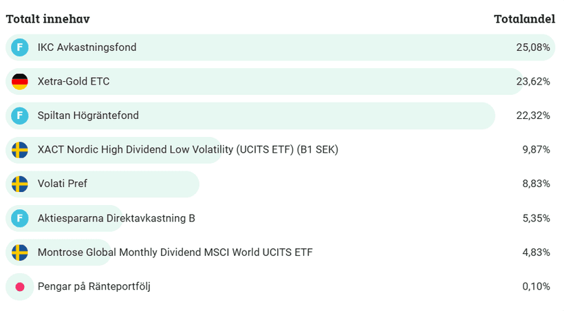 I nuvarande portfölj har jag stabila IKC Avkastningsfond, Guld värdepapper XETRA - Gold och innehåller även kända XACT Nordic High Dividend ETF:en. Det är en stabil portfölj och jag siktar som sagt att slå bostadslån räntan som ligger på runt 3,2%. Tänkte börja redovisa det här såsom jag gör med min vanliga portfölj. Senaste året har det gått väldigt bra och det beror på att guld innehavet gett en god avkastning.