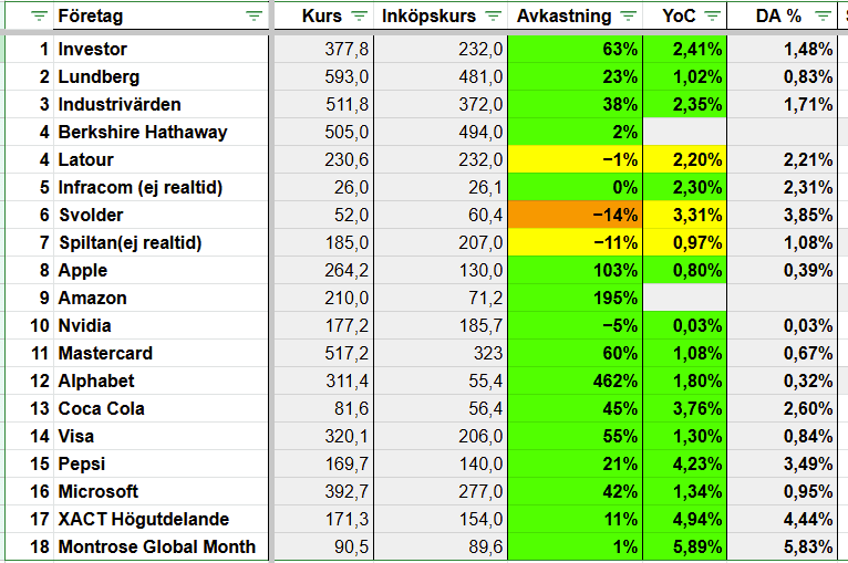 Investor som jag haft länge ligger YoC på 2,41% medan DA är 1,48%, här ser man klart och tydligt en utdelningstillväxt sedan jag köpt Investor.