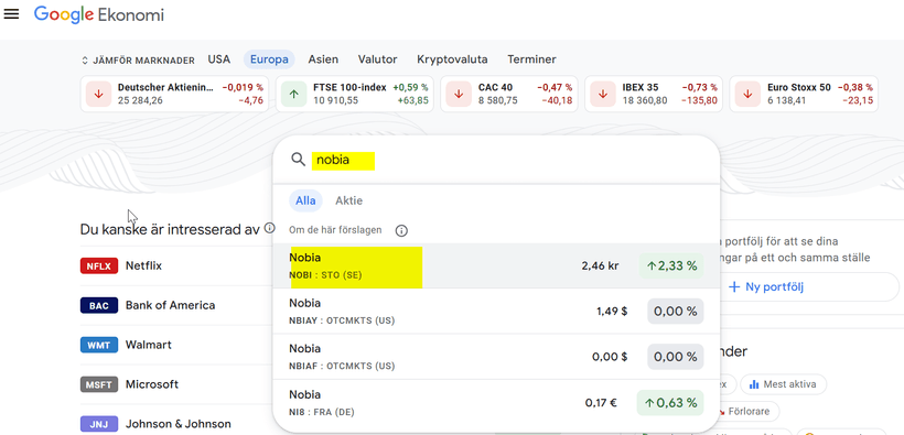 Nedan bild har jag tagit exempel för Nobia gäller =GOOGLEFINANCE("STO:NOBI"). Koden uppdaterar kursen i realtid automatiskt.