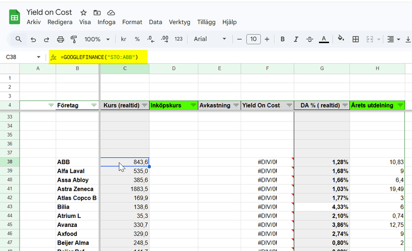 Jag har gjort ett enklare ark för den som själv vill följa upp sitt Yield on Cost och avkastning. En viss kunskap i excel eller google sheet krävs. Börja med att ladda ner mitt ark och spara det i din egna google drive.I arket finns det ungefär 60-70 bolag med kurser i realtid från google finance.