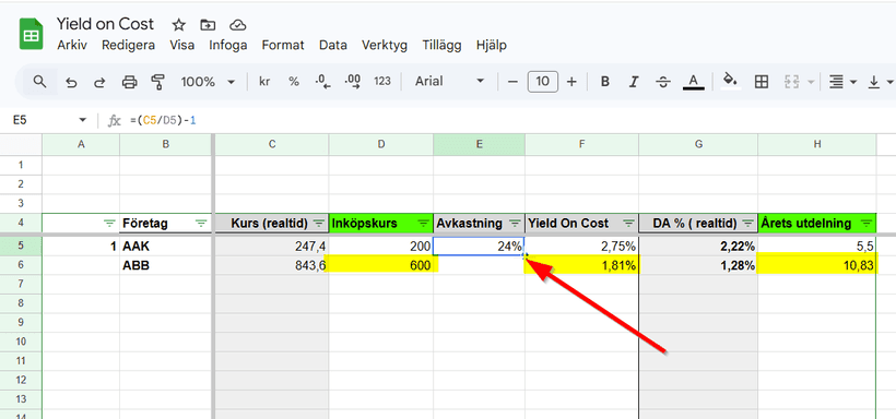 - Nästa steg är att registrera inköpskursen och årets utdelning om den inte finns med. Yield On Cost kommer då beräknas automatiskt. Under E kolumnen Avkastning behöver man dra ner formeln från första raden där AAK redan finns med som ett exempel. Så gör du för alla dina bolag.