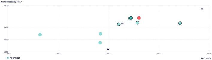 Addtechs rapport kom in över mina och andras förväntningar. Detta synliggörs då mitt är den röda och det verkliga siffrorna landade uppe i högra hörnet. Krysset där det genomsnittliga estimaten landade.