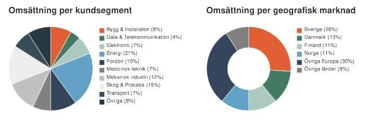 ” Ur ett geografiskt perspektiv var marknadsläget stabilt under året i Sverige och Danmark, svagt i Finland och starkt i Norge. På våra huvudsakliga marknader utanför Norden var affärsläget svagt i DACH medan det var stabilt i Benelux och sammantaget gynnsamt för våra bolag i UK. Vår försäljning utanför Norden fortsatte öka under året och uppgår rullande 12 månader till cirka 40 procent av vår totala omsättning”