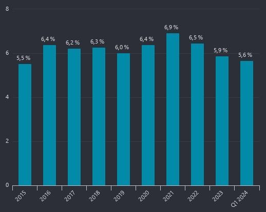 Rörelsemarginalen, som sagt, minskade till 4 % (5). Rullande 12-månaders så ligger den nu på 5,6 %. Det kan sättas i relation till 10-års snittet på 6,2 %.