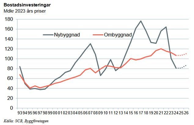 Ombyggnationsinvesteringar minskade även de förra året, men förväntas öka. De är dessutom inte lika ”ryckiga” som nybyggnation.