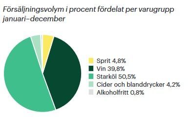 Försäljningsmässigt i volym är starköl det som det säljs mest utav. Värdemässigt så är det dock vin som står för halva omsättningen. Varannan krona som det handlas för på Systembolaget går till vin. Starköl står för drygt var fjärde krona.
