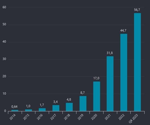 Ska jag våga mig på en gissning så ser vi ca 65 kr/aktie i vinst i slutet av 2024? Vi landar då på en forward PE om ca 20. Evolution är ett fantastiskt bolag som i nuläget bråkar med Investor om andra platsen i storlek i portföljen.