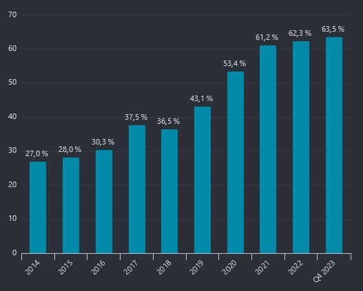 Sett till helåret ökade intäkterna med 23,5 %.