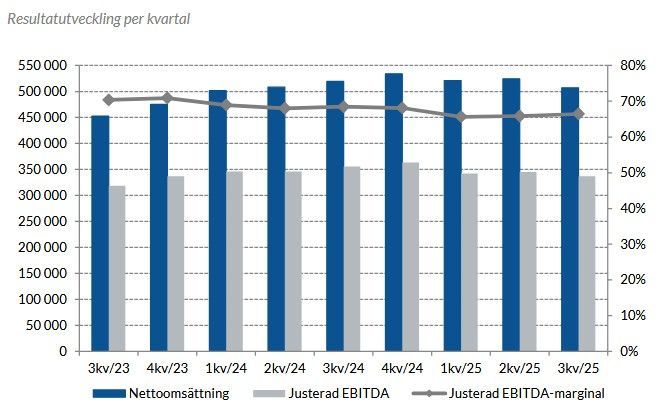 Så utvecklingen är dämpad, men följer det mönster som redan kunde anas i Q1 och Q2 med små rörelser i omsättning, viss marginalpress, men fortsatt starka kassaflöden. Bolaget ligger kvar inom sin prognos om en helårsmarginal på 66–68 %. Finanserna är fortsatt starka.