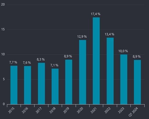 Rörelsemässigt så redovisar man en 12-månaders rullande vinst på 2,90 kr/aktie. Vinsterna har fallit och närmar sig nivåer innan eufori och byggboom-åren. Marginalerna var mycket goda då. 10-års snitt rörelsemarginal är ca 10 %. Idag, Q1 2024 rullande 12 månaders redovisar man 8,9 %.