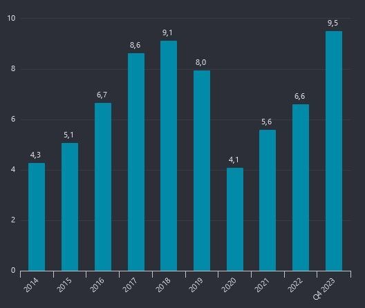För helåret rapporterar Gränges även där en något minskat försäljning, volym som omsättningsmässigt. MEN både rörelseresultat som vinst blev högre. Marginalerna har varit klart bättre 2023 än föregående år.