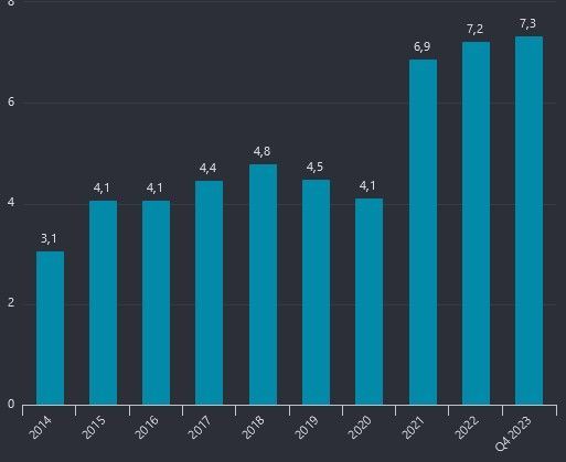 Jag tror personligen att denna ”nivån” kommer kunna hållas men den där starka tillväxten är borta för ett tag nu. Tills ny sats har kunnat tas. För 2024 så spår jag framåtsyftande ca 7 kr/aktie i vinst. Vid nästa årsskifte så har nog det utkristalliserats mer vad nya VD:n hittar på. Eventuella förvärv får ändå inget större genomslag under 2024 utan det blir i så fall 2025 tillväxtsresan kan eventuellt fortsätta. Men mycket kan som alltid hända.