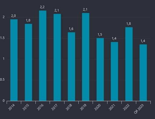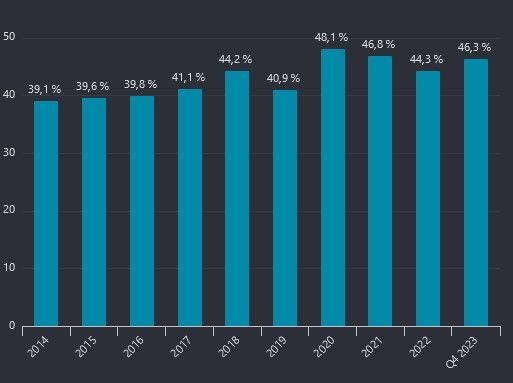 Rörelsemarginalen landade för 2023 på 13,3 % (13,4).