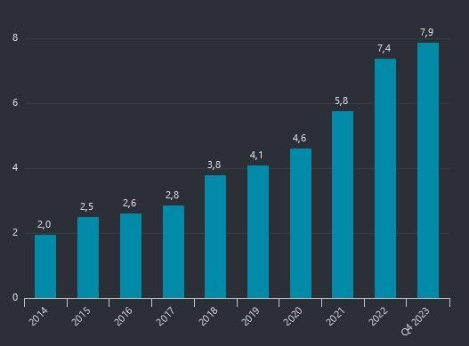 På mina servetter så är de långsiktiga antaganden jag har ca 10 % tillväxt årligen och 12 % rörelsemarginal så bolaget håller kursen gott och väl. Sett över en längre konjunkturcykel ca 2008-2023 så har Indutrade snittat på ca 12 % vinsttillväxt. Som synes i regel i lågräntemiljö men de verkar navigera sig framåt gott och väl även nu.
