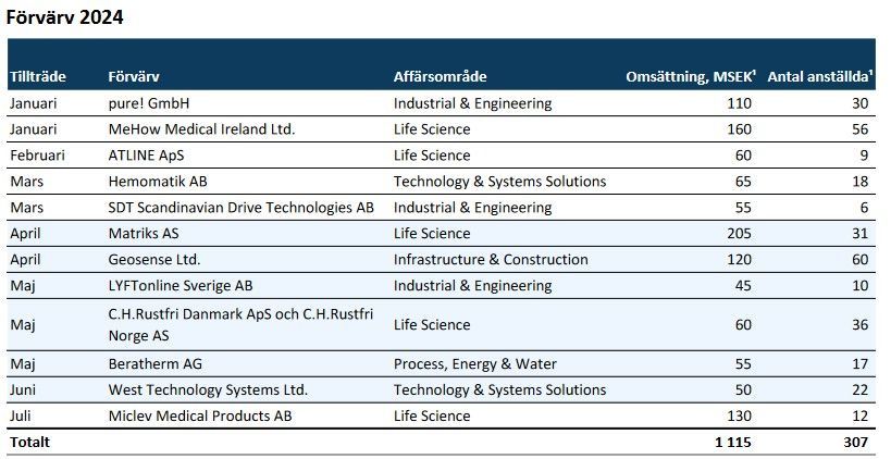 Förvärv är en del av den naturliga affärsverksamheten. Under 2024 har man hittills förvärvat verksamhet motsvarande ca 3,5 % av årlig omsättning. Tillsammans med, över tid, organiskt tillväxt ger sådant fin skjuts till den totala tillväxten. Över de senaste 10 åren har den varit ca 12 % i snitt per år.