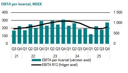 Kikar vi på 2025 så landade omsättningen på 13,6 mijarder kr, men det är marginalutvecklingen som är spannande. EBITA-marginalen för helåret landade på 5,9 %, vilket är en bit under bolagets finansiella mål på 8 % och det historiska snittet. Men det är här den stora nyheten kommer in, nämligen Q4:an