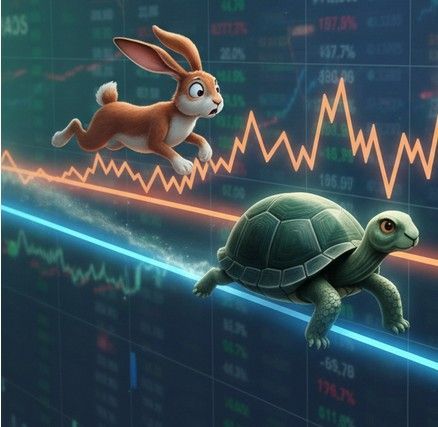 Det är precis som sagan om sköldpaddan och haren. Där, fastän haren springer snabbare, sköldpaddan går i mål före.