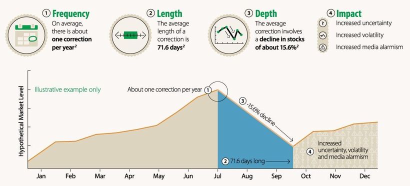 En korrektion på börsen brukar definieras som en allmän nedgång (kan i och för sig korrigera sig uppåt också men det skapar inte samma oro) på 10 % och däröver. I det så ligger det naturligtvis att om börsen som helhet sjunkit 10 % så finns individuella aktier som varierar stort från det, men generellt så rör sig den stora massan åt samma håll.