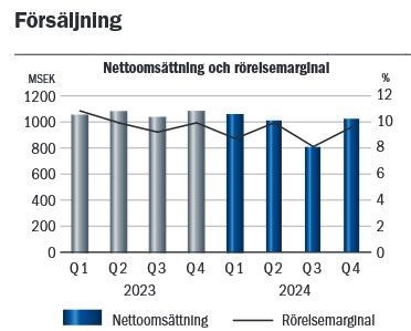 VD nämner bl.a. att branschen förväntas växa med i snitt 7 % per år fram till 2030. Lageranpassningar och sena volymneddragningar från kunder har försvårat lönsamheten men man har ändå hållit uppe marginalerna bra. Inför 2025 finns en försiktig optimism, där fortsatt elektrifiering förväntas driva branschen framåt. Även om orderstocken minskat något så förväntas försäljningen Q1 2025 ligga i linje med detta kvartalets. För 2025 förväntas inte marginalerna minska. Tvärt om. Man gissar på ca 10 %.