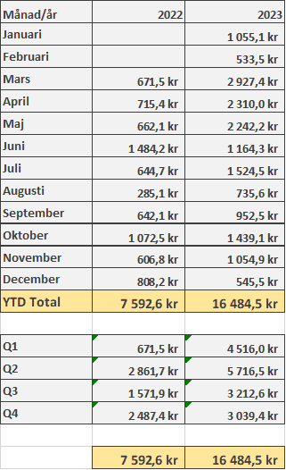 Som kan ses nedan landade utdelningarna på 545,5 sek efter att flertalet sena utdelningar från amerikanare och kanadensare gled över till 2024. Men det gläds vi ju åt i nästa genomgång! Känns kanon att glida in på år tre av min strategi med utdelningshöjare. Just nu har jag 36 stycken utdelningshöjare i portföljen och långsiktigt vill jag upp mot 50-60 innehav. Skälet till detta? Jag tror att jag då har byggt bort (eller minimerat) risken att jag som simpel amatör inte vet jag jag håller på med, i mitt försök att navigera i investeringsdjungeln.