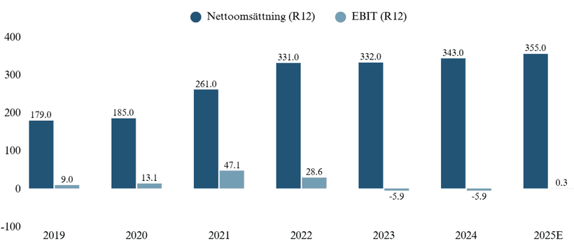 Sedan 2019 till 2024 har omsättningen stigit från 179 MSEK → 343 MSEK, en CAGR på 13,9 %. Trots ett par år med flat tillväxt och tufft rent lönsamhetsmässigt står man idag inför ett intressant 2026. Efter notering 2022 kom baksmällan i form av försämrad lönsamhet vilket till stor del går att koppla till organisk expansion och börsnoteringskostnader. Sedan notering har fokus legat på att öka personalstyrkan (stark och effektiv säljkår) och R&D → pressat lönsamheten. Förseningar inom försäljningsprocesser i Nordamerika har även legat till grund, där affärer har blivit fördröjda på grund av oklarheter inom amerikanska försvarsbudget → upphandlingar låg på is. Detta kan även sättas i relation till 2025, ett år som har präglats av försenade kundprocesser i USA, till följd av ny administration och government shutdown, men även misslyckade satsningar av segmentet Resilience (där man nu inför kostnadsbesparingar).