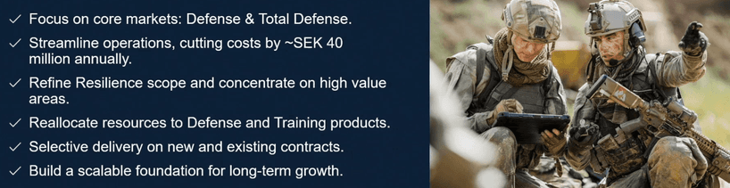 På detta lanserade man ett kostnadsbesparingsprogram i Q3 2025 där man avser att driva ”Resilience”-segmentet mer försiktigt. Målet är att spara cirka 40 MSEK i OPEX årligen där ~80% kommer gå direkt till bottom line. Detta kommer redan att vara fullt synligt från och med Q1 2026. Man rör sig därmed mot ett mer renodlat mjukvarubolag inom försvar, med höga marginaler, och en stark position i en marknad med höga inträdesbariärer och strukturell medvind. 4C kommer kunna lättare att skala nu när man fokuserar endast på försvar där tillväxten finns.