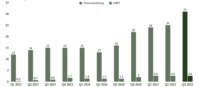 Till skillnad från traditionella byggbolag är Tekova extremt kapitallätt eftersom de själva inte leder processen för den fysiska byggproduktionen. I stället sköter bolaget projektutveckling och designledning i nära samarbete med utvalda entreprenörer och partners. Modellen gör att Tekova kan hålla en flexibel kostnadsstruktur och fokusera på värdeskapande genom planering, kundrelationer och projektledning. I takt med detta har man betydligt högre marginalerna än branschsnittet vilket visar på att Tekova har en mycket effektiv organisation och stark operationell förmåga. 2025 har varit ett bra år för bolaget där man justerat sin 2025-guidance tre gånger. I Q3 levererade man imponerande siffror: