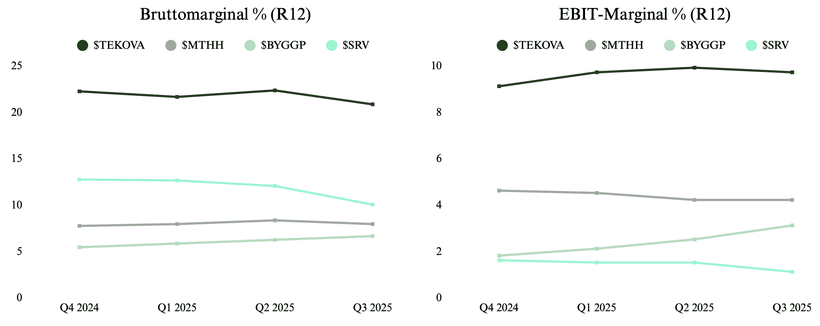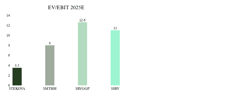 I samband med att marknaden inte tror att marginalerna eller tillväxten är uthållig här, handlas man till väldigt låga multiplar. Jag gillar setupen där konsensus ser flat tillväxt i 2026 vilket kan ge positiv reaktion på uppsidan om man lyckas växa försiktigt samt bibehålla sina marginaler. Efter en uppgång på ~47% iår handlas man fortsatt till 3,5 EV/EBIT 2025E samtidigt som peers handlas klart över. På detta tycker jag Tekova är ett kvaliteplay där man får ett best in class bolag med högre marginaler än konkurrenter samtidigt som man har en kompetent ledning med lång erfarenhet av byggbranschen.