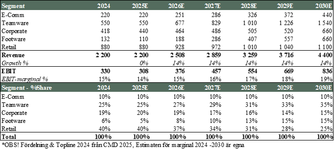 Bryter vi ner den information vi har fått från bolaget och antar marginalerna enligt tidigare text, kan vi se att målet 2030 implicerar en CAGR på topline om ~14%. På EBIT-nivå tar jag antagandet att vi går från 308 miljoner SEK till 836 miljoner, om vi estimerar att Craft har en marginalexpansionsresa liknande New Waves egna mål för marginalen, fram till 2030. Marginalresan består till stor del av att segment med lägre marginal (Retail) får en lägre vikt i bolaget och högre marginalsegment mognar och för högre vikt.