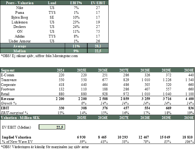 Fortsätter vi med att försöka värdera Craft med globala och lokala peers får vi en EBIT-multipel på strax över 20, vilket jag kan tycka är helt rimligt för ett bolag som växer 14% och expanderar marginalen. Jämför man med Björn Borg till exempel bör Craft ha en högre värdering på grund av högre marginal, snabbare tillväxt, ägarstruktur och storlek. Vi ser även att detta implicerar en värdering för Craft om 6,9 miljarder SEK på 2025E vilket närmar sig 50% av New Waves värdering detta kan jämföras med att Craft står för 20-25% av hela koncernens omsättning.