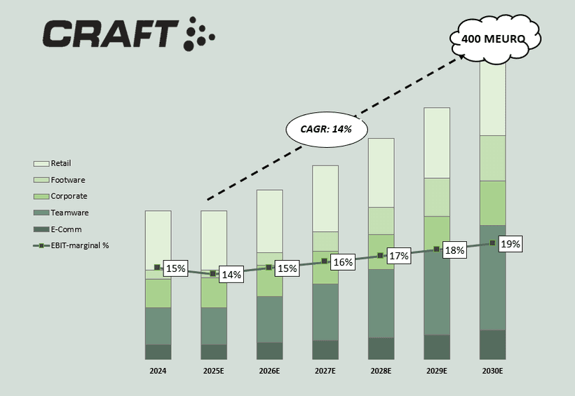 Några exakta siffror för bolaget har vi inte, men under kapitalmarknadsdagarna 2024 och 2025 har man slängt sig med 200 miljoner euro i omsättning och bruttomarginaler över koncernens egen marginal om 50%. Vi kan därför gissa att bolaget är ledande marginalmässigt bland Sport & Fritid segmentet samt med en av de högre EBIT-marginalerna i koncernen. För att förenkla det räknar jag med att de just nu rullar en 14% EBIT-marginal för Craft, vilket både kan vara högre eller lägre. Det har även kommunicerats ett mål för Crafts omsättning till 2030 (tidigare 2027) om 400 miljoner euro topline.