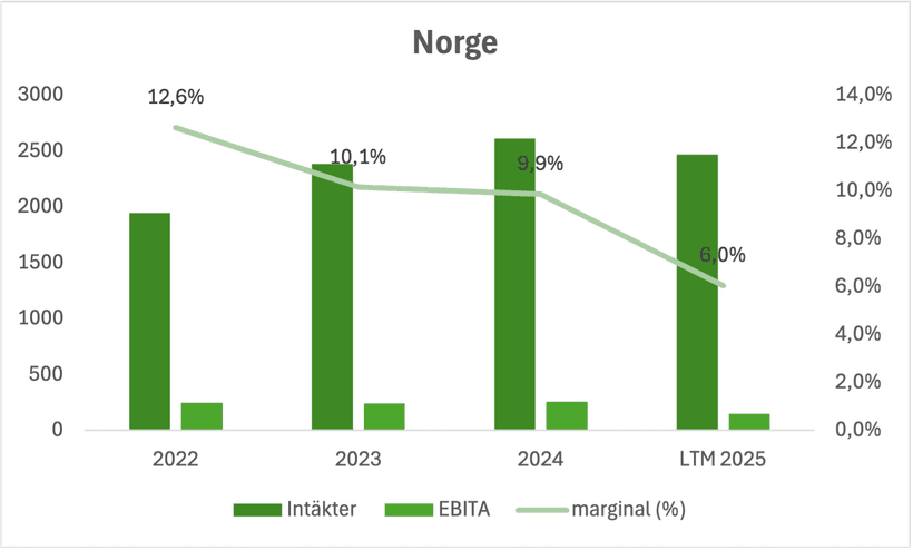 Norge står för 41 procent av intäkterna och 44 procent av EBITA. 2024 uppgick nettoomsättningen till 2,6 miljarder och EBITA resultatet till 257 Mkr, vilket ger en EBITA-marginal 9,9 procent. I Norge är exponeringen mot finplanering och anläggning större. Kunderna är 60 procent offentlig sektor och 40 procent privata företag.