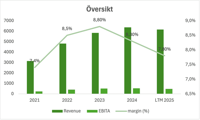 År 2024 uppgick omsättningen till 6,3 miljarder kronor och EBITA resultatet till 528 Mkr. Tillväxten var nio procent, varav tre procent var organisk och resterande härleddes från förvärv. Totalt förvärvades åtta bolag under året.