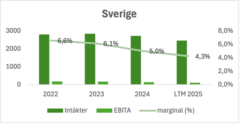 Lönsamheten mätt i EBITA-marginal har varit i nedåtgående trend sedan 2022, då den uppgick till 6,6 procent. Orsaken förklaras av en tuffare konkurrens, i synnerhet inom finplanering och anläggning, och detta har medfört prispress som resulterat i lägre marginaler. För att vända trenden initierade bolaget ett program under 2024 för att stärka lönsamheten, och detta innebar avveckling av lågpresterande bolag och utbyte av personer i ledande ställning. Enligt VD Johan Nordström har arbetet pågått successivt under 2025 och kommer få fullt genomslag 2026. Nordström lyfte fram i senaste conference call att marginalerna i Sverige väntas överstiga historiska nivåer 2026, då man inte längre påverkas av de lågt presterande affärs enheterna.