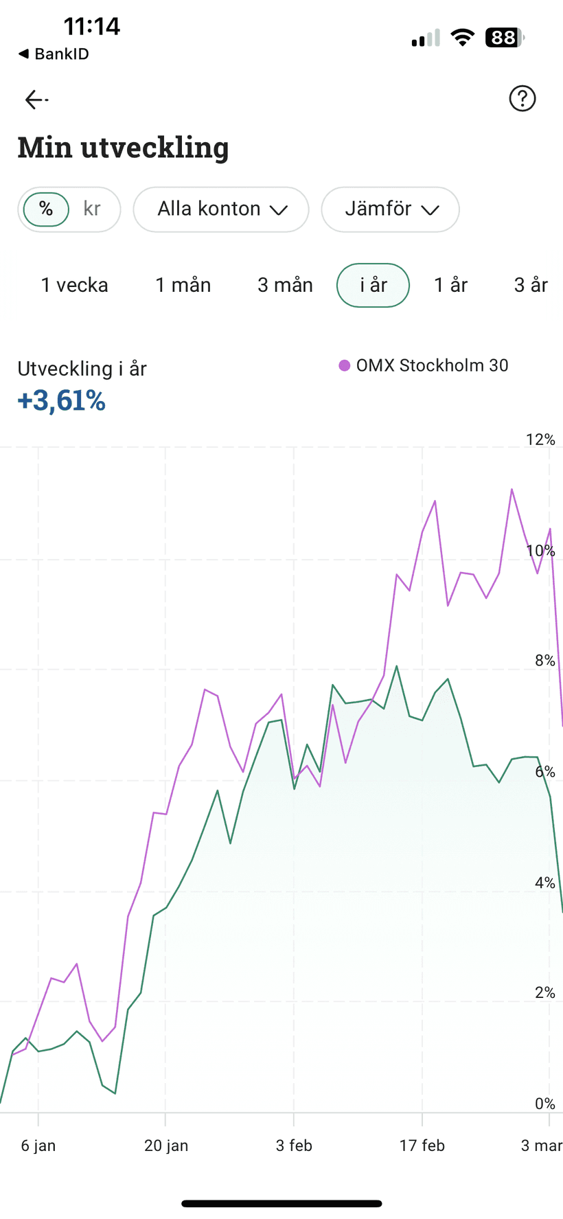 Jag förväntade mig inte heller någon väsentlig uppgång i något av mitt innehav, då tesen som mina case grundare sig på helt enkelt inte utspelat sig ännu. Min avkastning YTD är cirka +3,6% något som jag såklart inte är ett dugg nöjd med, men tycker ändå att perspektivet är alldeles för kort för att utvärdera något. Det är såklart väldigt lätt att hamna i tankebanor som är mentalt jobbiga under sådan här perioder, och jag skulle ljuga om jag sa att jag inte tyckte det var jobbigt att ligga efter index i år. Värt att tilläga är att i år har verkligen storbolagen visat styrka medan småbolagen halkat efter något och OMXS Small Cap PI är enbart upp +1,6% i år.