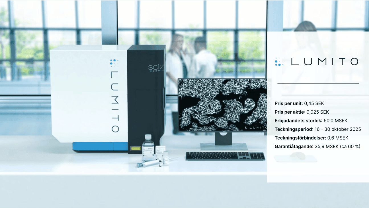 Lumito är i kommersialiseringsfasen med sin patenterade UCNP-teknik, som möjliggör mer precisa och objektiva vävnadsanalyser. Den pågående emissionen stärker bolagets finansiella ställning inför lansering på en snabbt växande global marknad för digital patologi.
